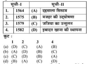 सूची-1 में दिये गये विर्षों का मिलान सूची-II में दिये गये अकबर के शासन काल की मुख्य घटनाओं से कीजिए और नीचे दिये विकल्पों से सही उत्तर चुनिएः