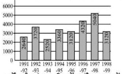 निर्देशः (91-95): बार ग्राफ को ध्यान से पढ़िये और प्रश्नों के उत्तर दीजिए। नीचे दिए गए बार ग्राफ में एक देश का 1991-1992 से 1998-1999 तक का फॉरेन एक्सचेंज रिजर्व (मिलियन यू.एस. $) में दिया है।