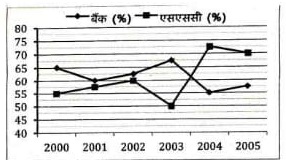 नीचे दी गई तालिका में वर्ष 2000 से वर्ष 2005 के दौरान बैंक एवं एसएससी परीक्षाओं में भाग लेने वाले अभ्यर्थियों की संख्या (हजार में) दर्शाई गई है। साथ ही एक रेखा ग्राफ भी दिया गया है जिसमें बैंक एवं एसएससी परीक्षा में उत्तीर्ण अभ्यर्थियों का प्रतिशत दर्शाया गया है।